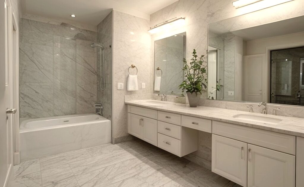 We designed a modern minimalist bathroom with light-colored tiles for our client. After reviewing the photos, we utilized our 3D software to create the bathroom design. Upon the client’s approval, we successfully completed the installation while staying within their budget.